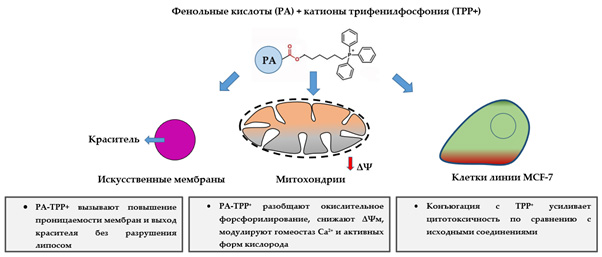В настоящей работе авторы химически модифицировали фенольные кислоты, присоединив к ним трифенилфосфониевый катион (TPP⁺) — известный «навигатор» для доставки веществ в митохондрии. Такие конъюгаты раньше использовались в антиоксидантах семейства MitoQ, SkQ, MitoVitE и др.