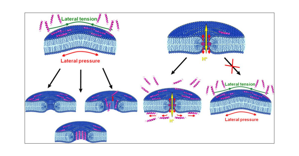 Авторы работы рассмотрели два возможных сценария порообразования. Согласно локальному сценарию, поры возникают в непосредственной близости от пептидов. Их внедрение в мембрану в большой концентрации вызывает формирование пептид-липидных каналоподобных структур. В нелокальном сценарии расположение пор не связано с положением пептидов. Согласно этому сценарию, пептиды адсорбируются на мембране, сдавливают один её слой и растягивают другой, из-за чего между слоями возникает дисбаланс латерального давления и натяжения. При образовании пор дисбаланс уменьшается, что стало важным открытием, сделанным в данном исследовании.