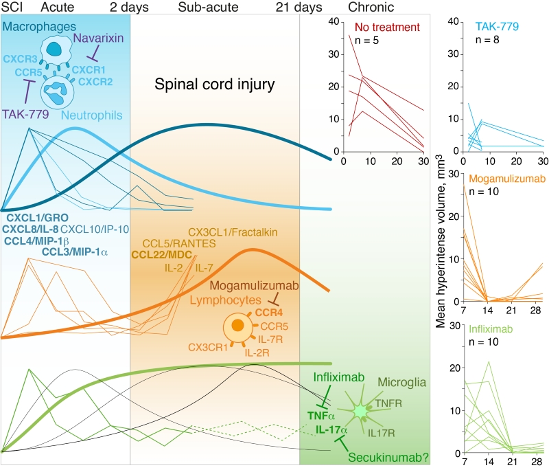 - TAK-779 (низкомолекулярный антагонист CCR5/CXCR3) и MK-7123/Навариксин (антагонист CXCR1/2) продемонстрировали выраженный эффект в острой фазе ТСМ, значительно уменьшая воспаление и отёк спинного мозга в первую неделю после травмы.