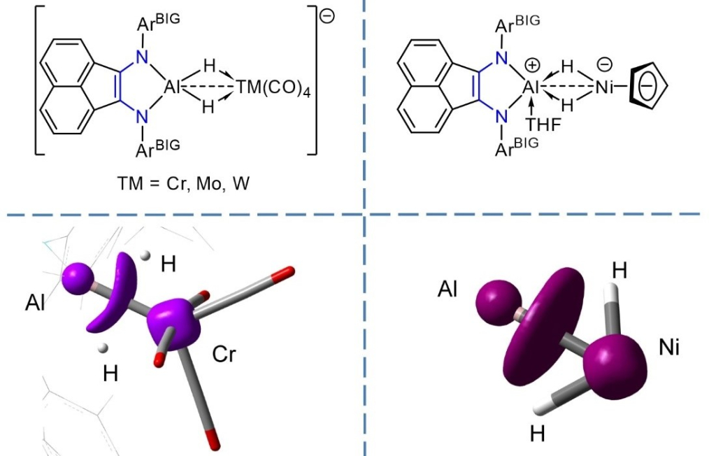Сотрудники ИМХ РАН показали, что стратегическое использование стерически затрудненного редокс-активного лиганда ArBIG-bian (ArBIG-bian = 1,2-бис[(2,6-дибензгидрил-4-метилфенил)имино]аценафтен) позволяет сформировать центры Al(μ2-H)2TM (TM = Cr, Mo, W, Ni, Er), стабильность которых обусловлена не одним классическим взаимодействием, а уникальным синергизмом трёх факторов: ковалентного связывания в гидридных мостиках Al(μ2-H)2TM, прямого взаимодействия TM–Al и внутримолекулярного электростатического взаимодействия между локализованными формальными зарядами. В отличие от ранее известных систем, такое множественное связывание представляет собой исключительный случай. Предложенная модель связывания, подтверждённая детальными расчетами методом DFT, выгодно отличает полученные соединения от описанных ранее аналогов.