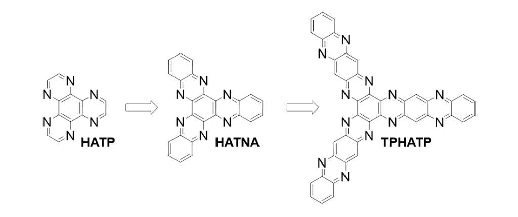 Малые молекулы и ковалентные органические каркасы с фрагментами гексаазатрифенилена (HATP) и гексаазатринафтилена (HATNA) ранее уже зарекомендовали себя в качестве перспективных катодных материалов для КИА. Основной задачей данной работы было расширение π-системы молекул такого типа и увеличение концентрации в них редокс-активных азот-содержащих центров, что и было достигнуто в результате синтеза TPHATP.